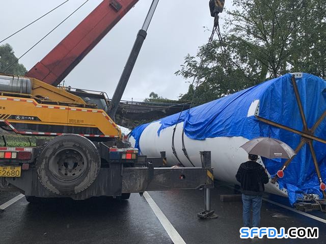 一辆搭载着风力发电机塔杆的货车撞上车行天桥导致道路交通中断
