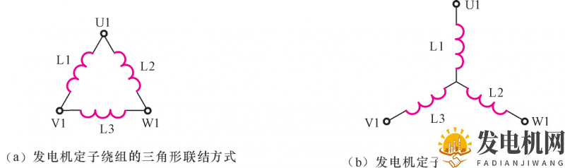 发电机的定子接法主要可以分为两种,即三角形(△形)联结和星形(Y形)联结,如图9所示。在发电机中,通常发电机定子的3个绕组一般都联结成星形。
